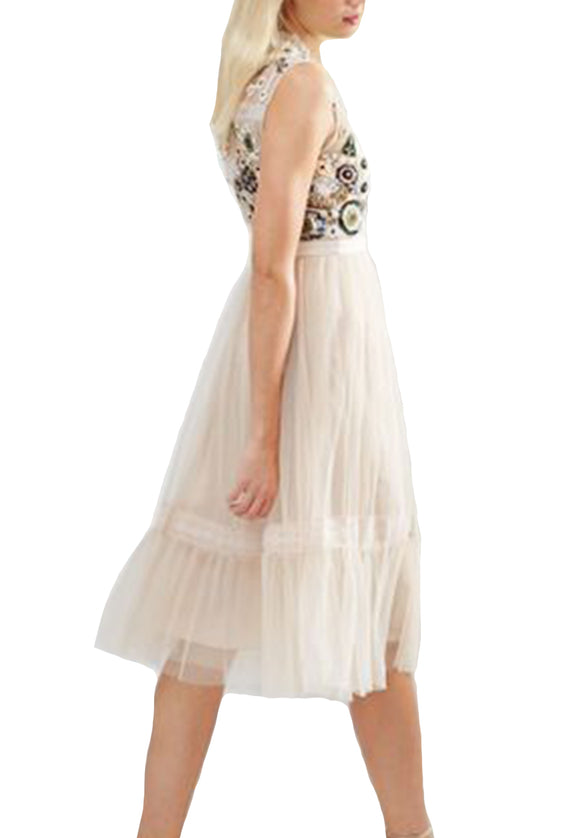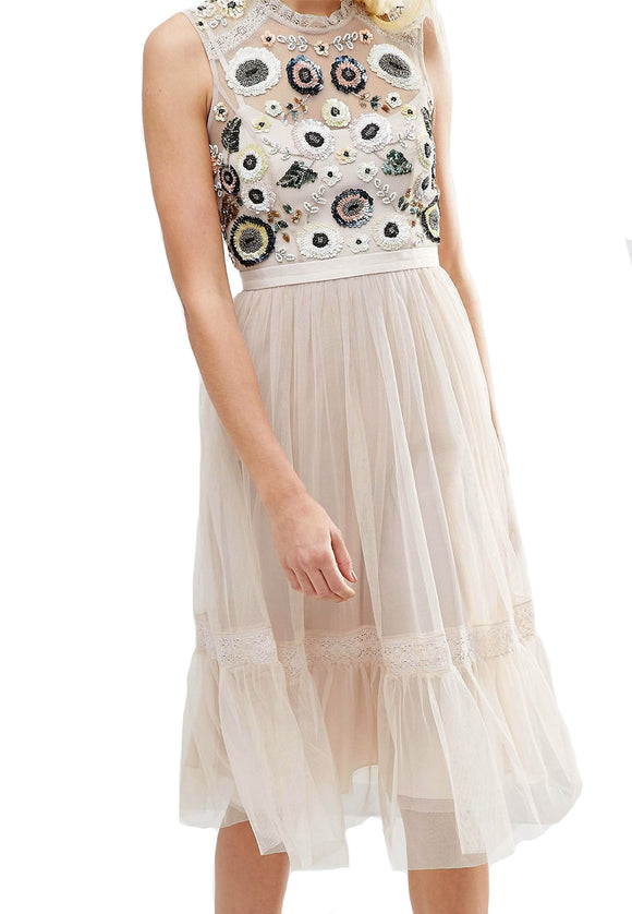 Nude Shimmer Ditsy Sleeveless Floral Embellished Gown (UK 4)
