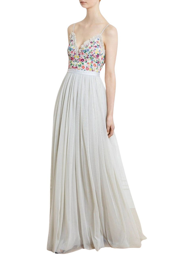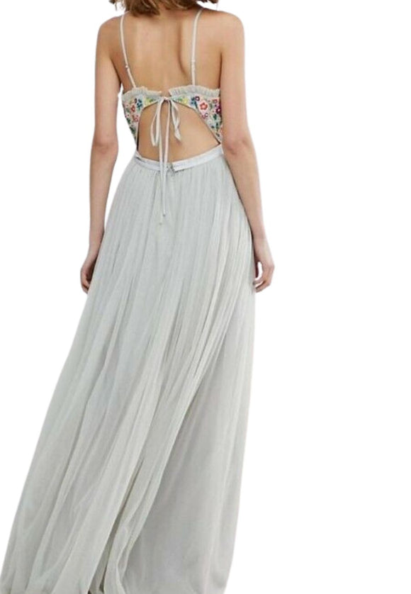 Light Grey Tie Back Cami Floral Embroidered Maxi Dress