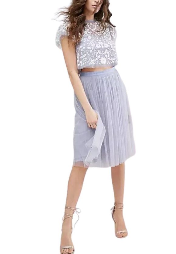 Nude Comet Embellished Tulle Cropped Top and Skirt