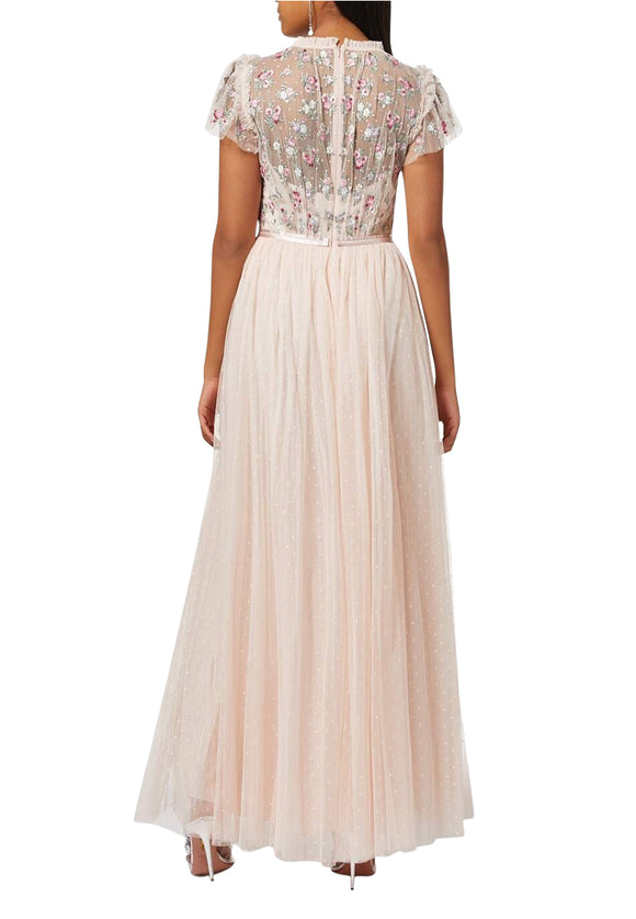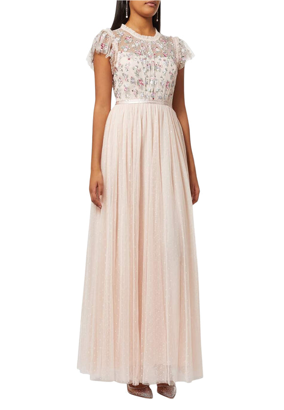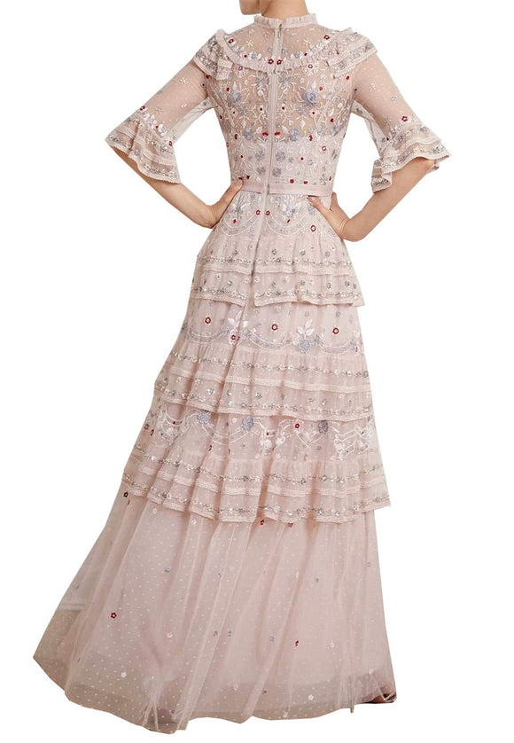 Pink Dragonfly Garden Ruffled Sleeves Embellished Tulle Gown (UK 8)