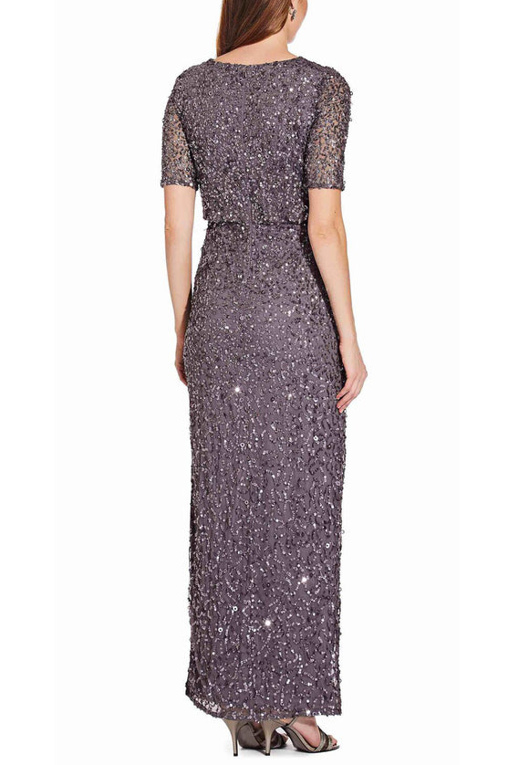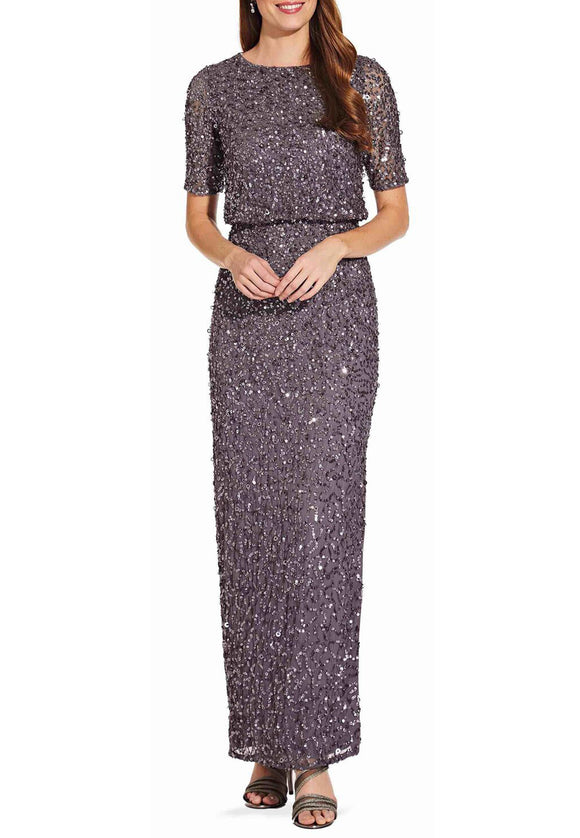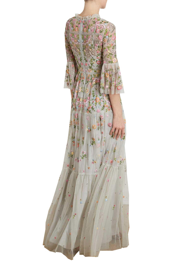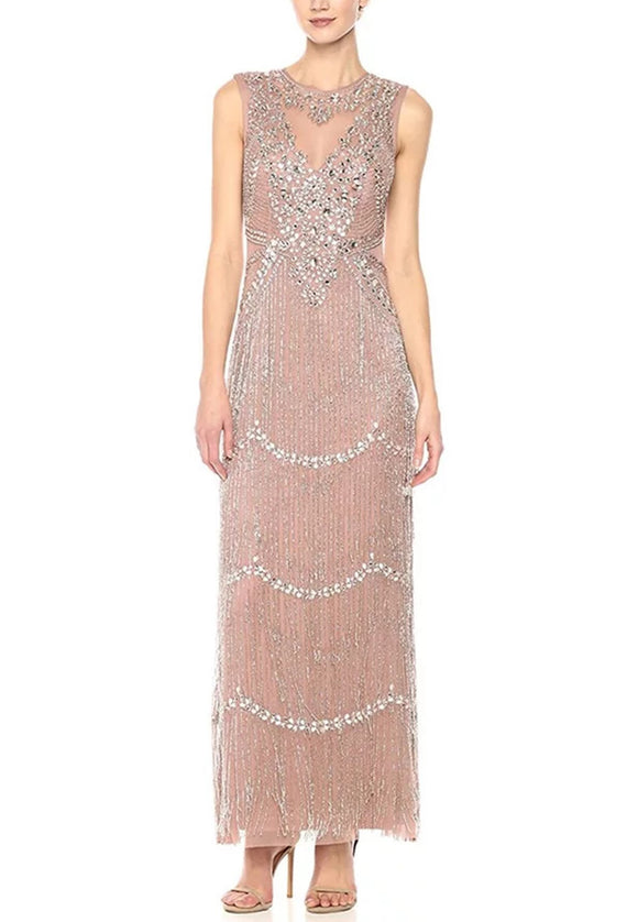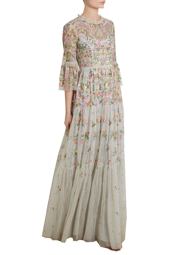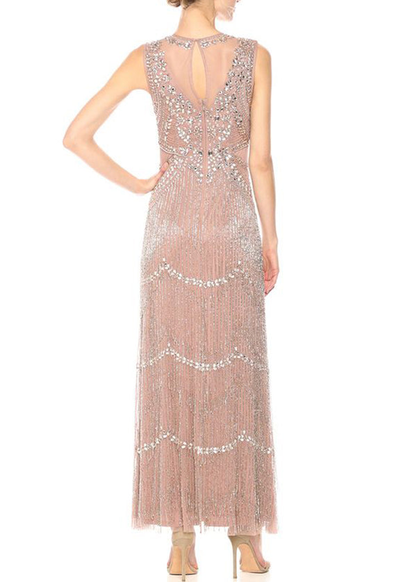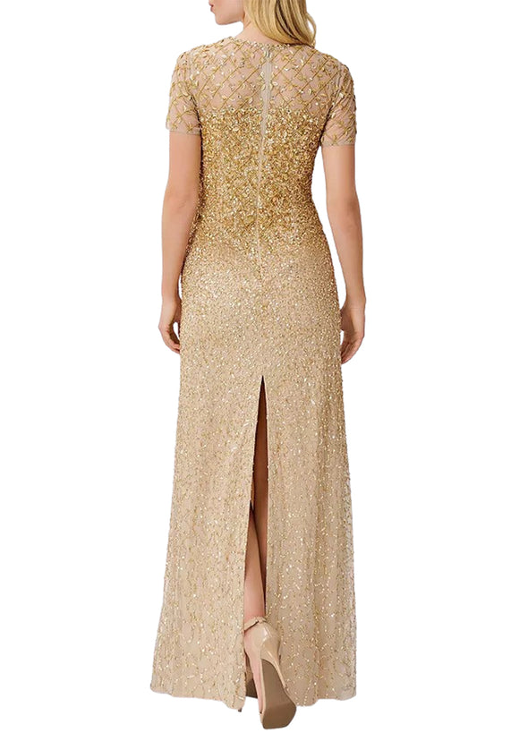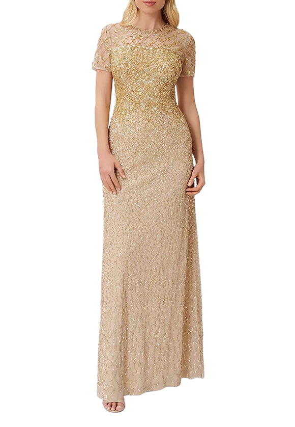 Nude Floral Beaded Dress with Sheer Flutter Sleeves