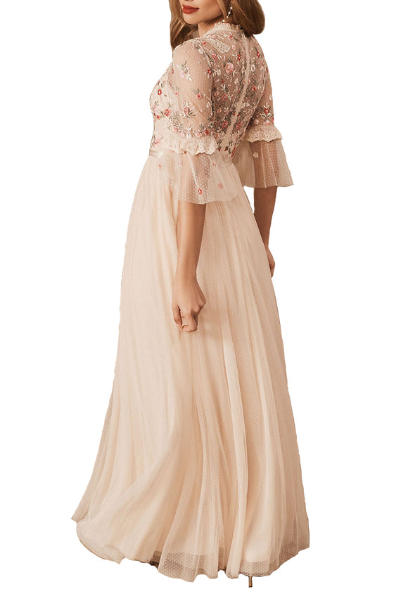 Nude Long Sleeves Sequins Dotted Tulle Maxi Dress