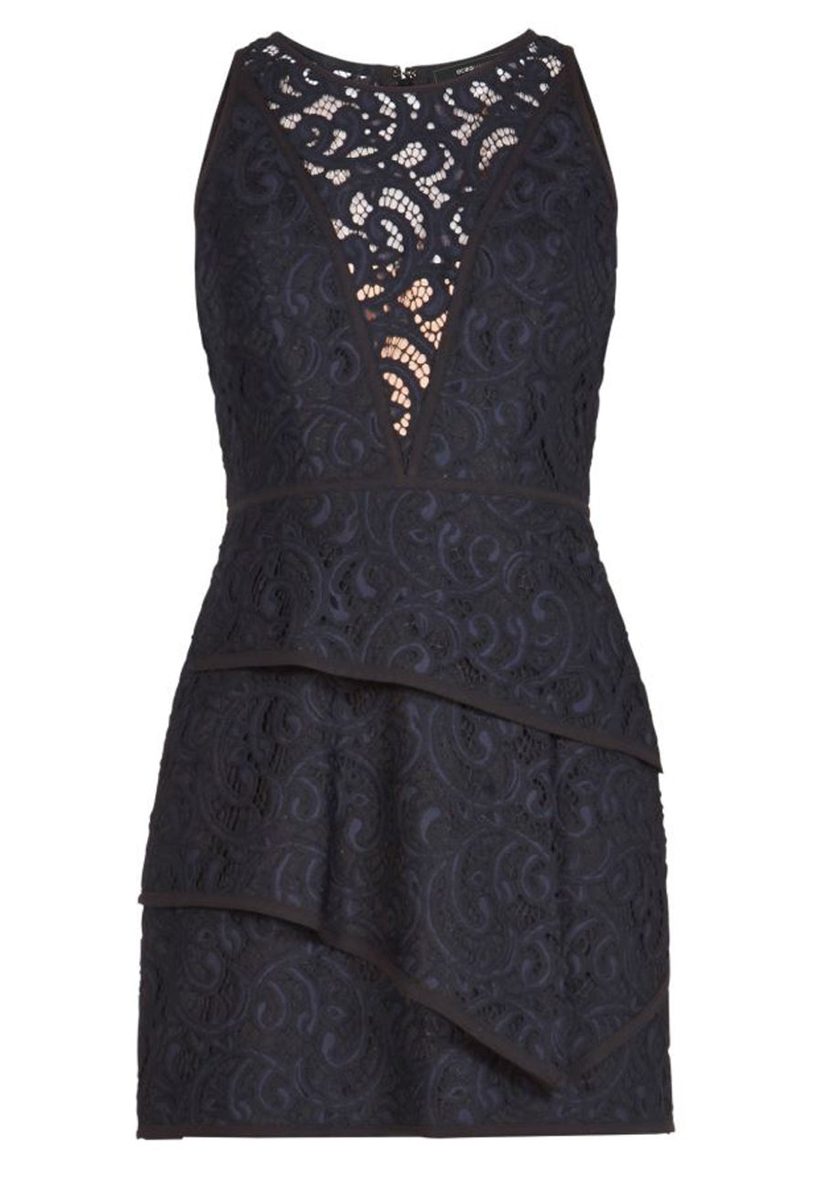- A daringly sheer lace neckline and back, balanced by its playful flared skirt with architectural asymmetrical tiers.